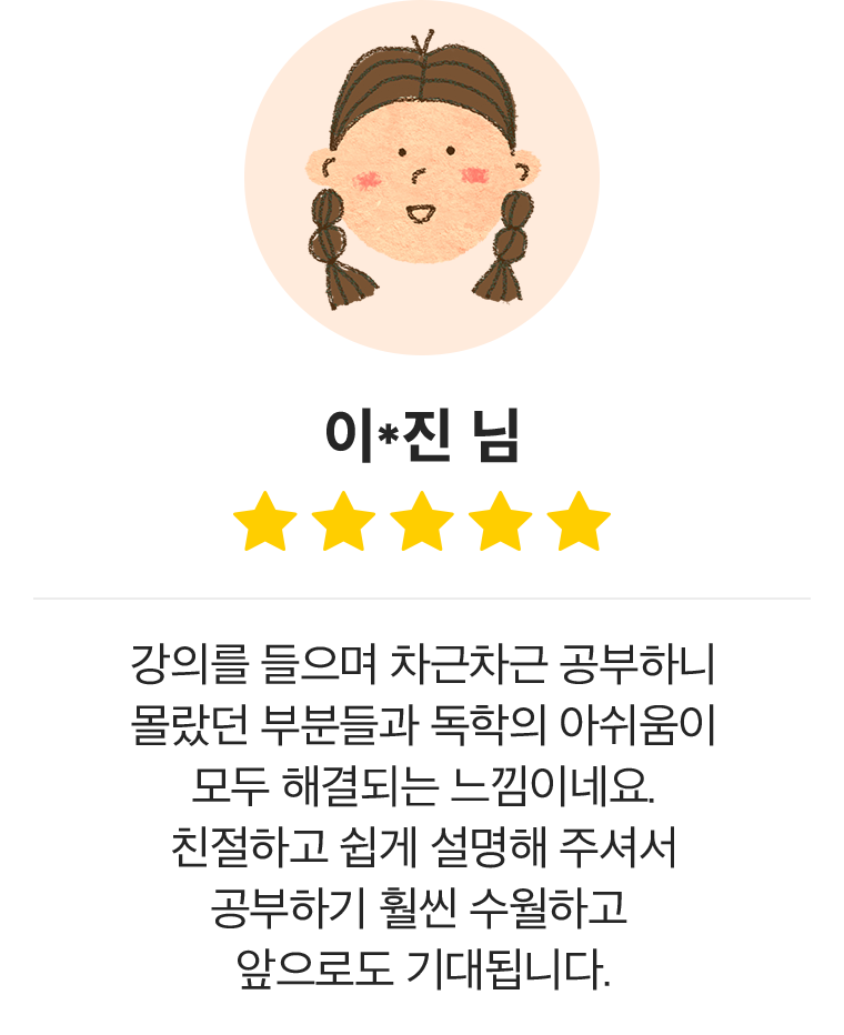 사실 온라인 강의 신청해놓고 다 못 끝낸 적이 많았는데 이번에 마지막 강의까지 들었습니다. 물론 매직 트리 하우스 책 내용이 너무 재미있지만, 무엇보다 김승규 선생님 강의가 귀에 쏙쏙 들어와서 지루하지 않게 들었던 것 같습니다. 어린아이들도 이해하기 쉽게 설명해 주셔서 부담 없네요 ^^ 계속 반복되는 문법 내용들도 종종 짚어주시니 억지로 외우지 않아도 자연스레 이해될 수 있었습니다!