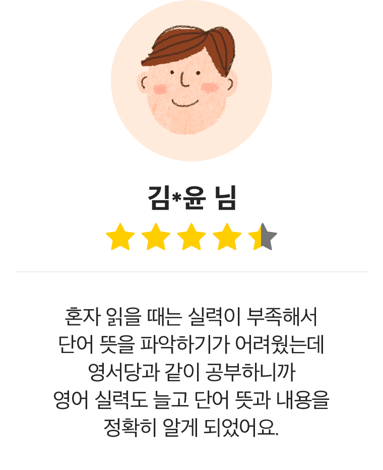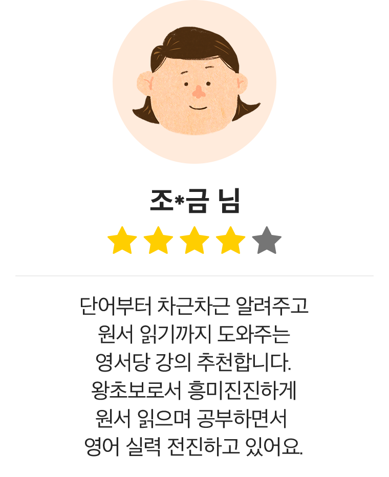 승규쌤 강의 들으면서 우리 아이의 원서 리딩에 대한 거부감도 없어지고, 어른도 다시 예전 추억 되새기며 영문법도 공부하고, 문장 해석도 하다 보니 어렵게만 느껴지던 영어공부에 활활 의지가 타오릅니다. 발음, 독해, 문법을 두루두루 재미있는 네이트와 함께하니 시간이 너무 빨리 가네요. 남은 수강도 열심히 듣고 영어에 대한 울렁증에서 벗어나도록 해 보렵니다.